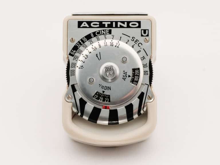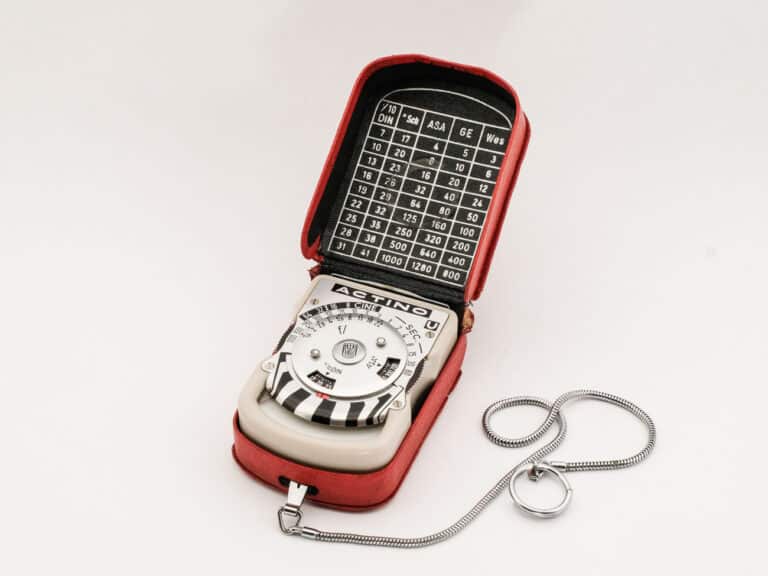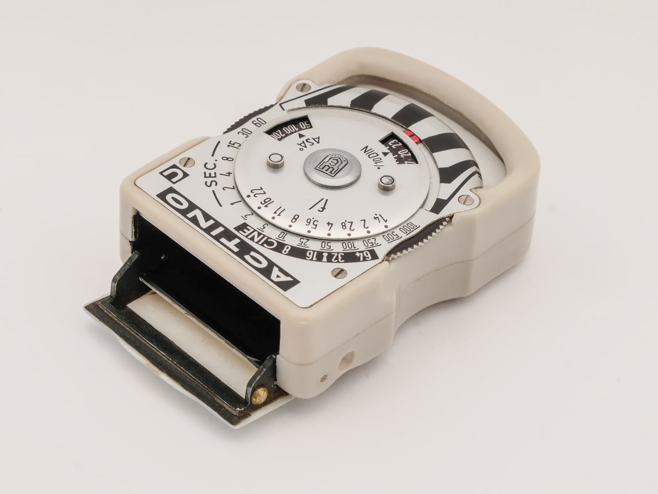 Selenbelichtungsmesser des Familienunternehmens K. H. Weigand Messtechnik, Erlangen (Weigand & Ehemann), 1954. Das solide gemachte Instrument weist eine übersichtliche Bedienoberfläche auf. Vor der Lichteintrittsöffnung ist an einer Klappe die Streuscheibe für Lichtmessungen angebracht. Bei Objektmessung wird das Licht durch die geöffnete Klappe über einen Spiegel nach unten auf die Messzelle gelenkt. Die Selen-Messzelle erzeugt, abhängig von der Helligkeit, einen elektrischen Strom, der zur Ansteuerung des Zeigerinstruments eingesetzt wird, eine zusätzliche Stromquelle ist nicht erforderlich. Die Skalenwerte: Zeiten von 1/1.000 Sekunde bis 60 Sekunden, Blenden 1,4-22, Empfindlichkeiten ASA 6-400/DIN 8-26, Cine 8-64 Bilder/Sekunde.