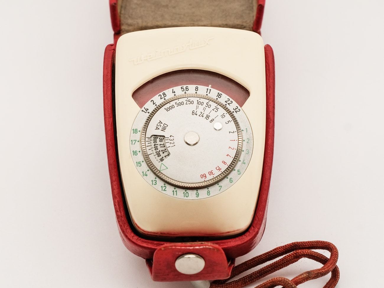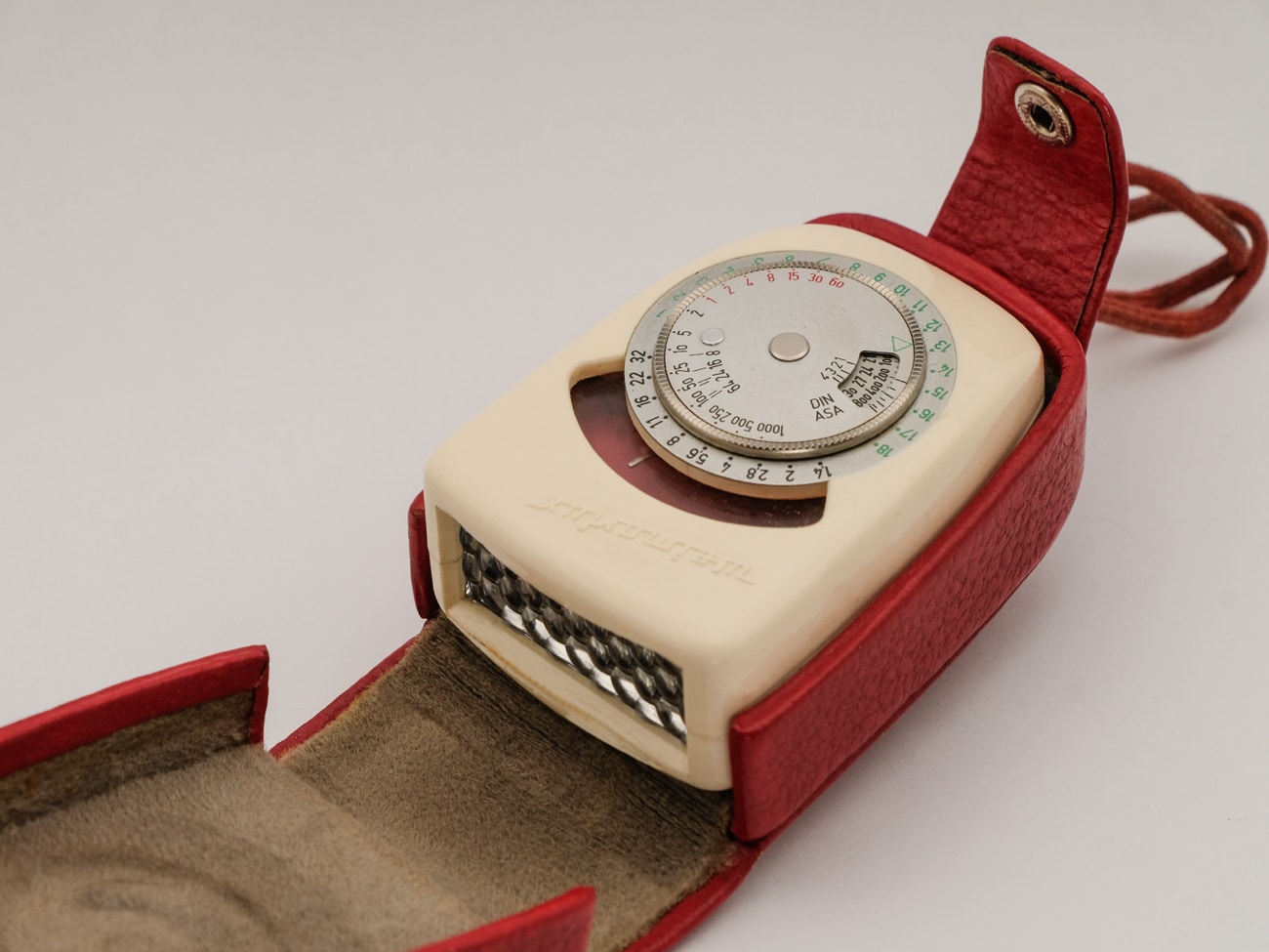 Selenbelichtungsmesser des VEB Feingerätewerks Weimar ab 1958. Die Selenzelle erzeugt, abhängig von der Helligkeit, einen elektrischen Strom, mit dem ein Zeigerinstrument angesteuert wird, eine zusätzliche Stromquelle ist nicht erforderlich. Bei der Messung wird ein Nachführzeiger mit dem Messzeiger zur Deckung gebracht, danach können auf der Einstellscheibe die Belichtungswerte abgelesen werden. Im Unterschied zu früheren Versionen wird bei diesem Modell die Filmempfindlichkeit in einem gemeinsamen Fenster für DIN- und ASA-Werte angezeigt. Mit einem ansetzbaren Kunststoffstreifen (hier nicht mehr vorhanden) ist auch die Lichtmessung möglich. Die Skalenbereiche: Belichtungszeiten von 1/1.000 bis 60 Sekunden, Blenden 1,4-32, Empfindlichkeiten DIN 6-33/ASA 3-1.600, Lichtwerte 1-18, Cine-Gangzahlen 8-64. Diesen Belichtungsmesser gab es auch mit schwarzem Gehäuse.