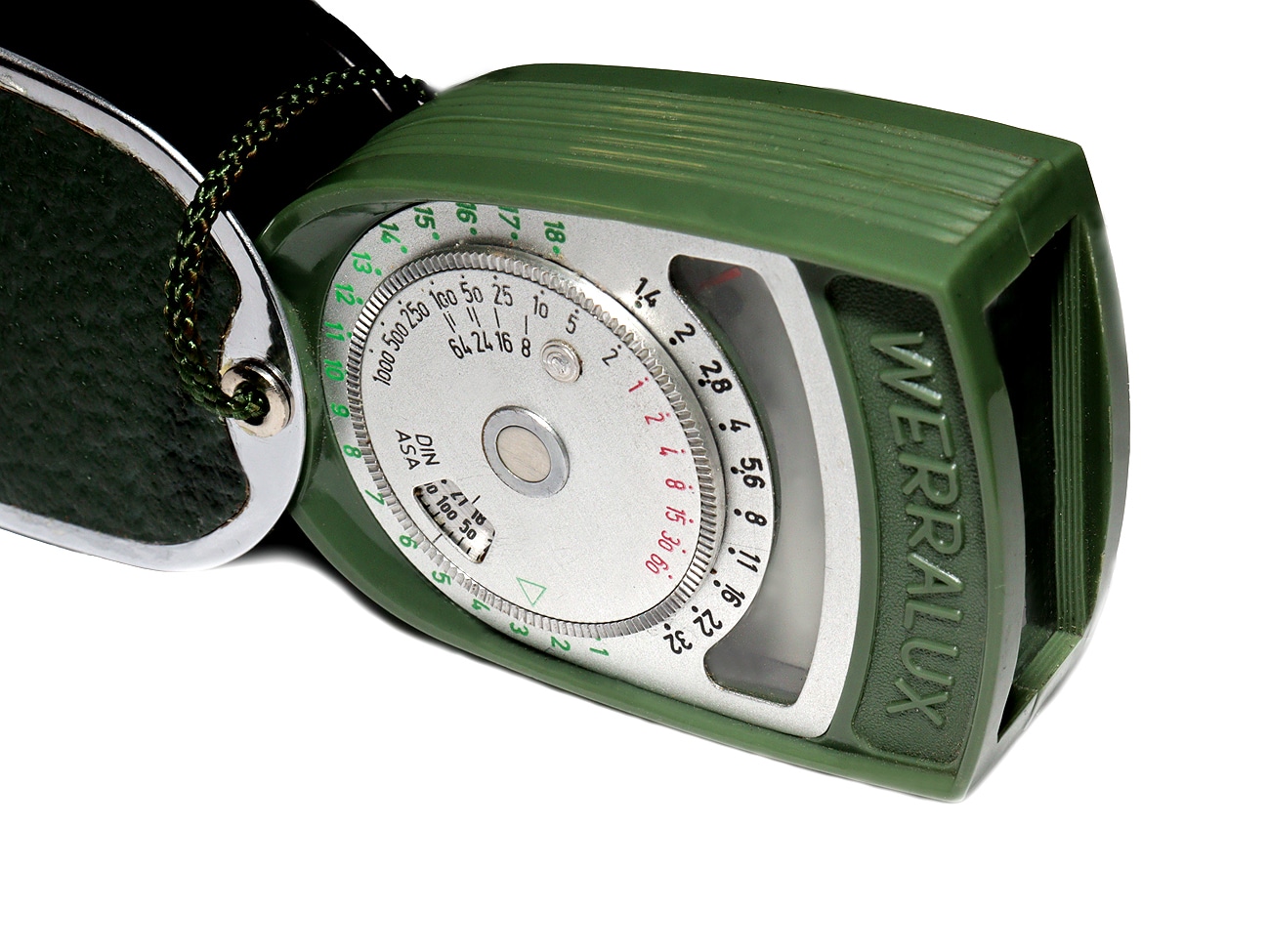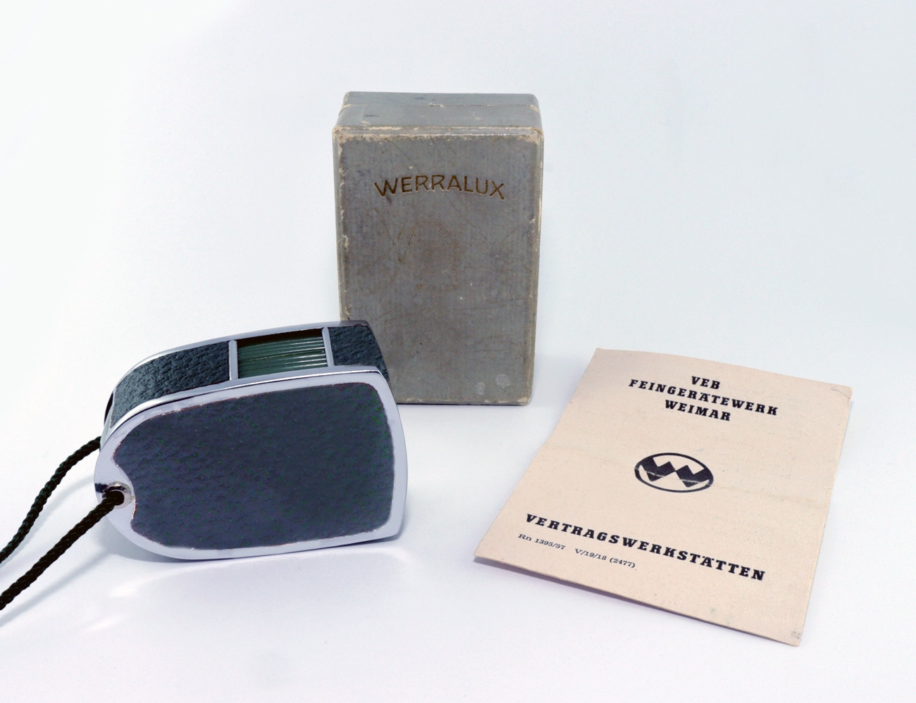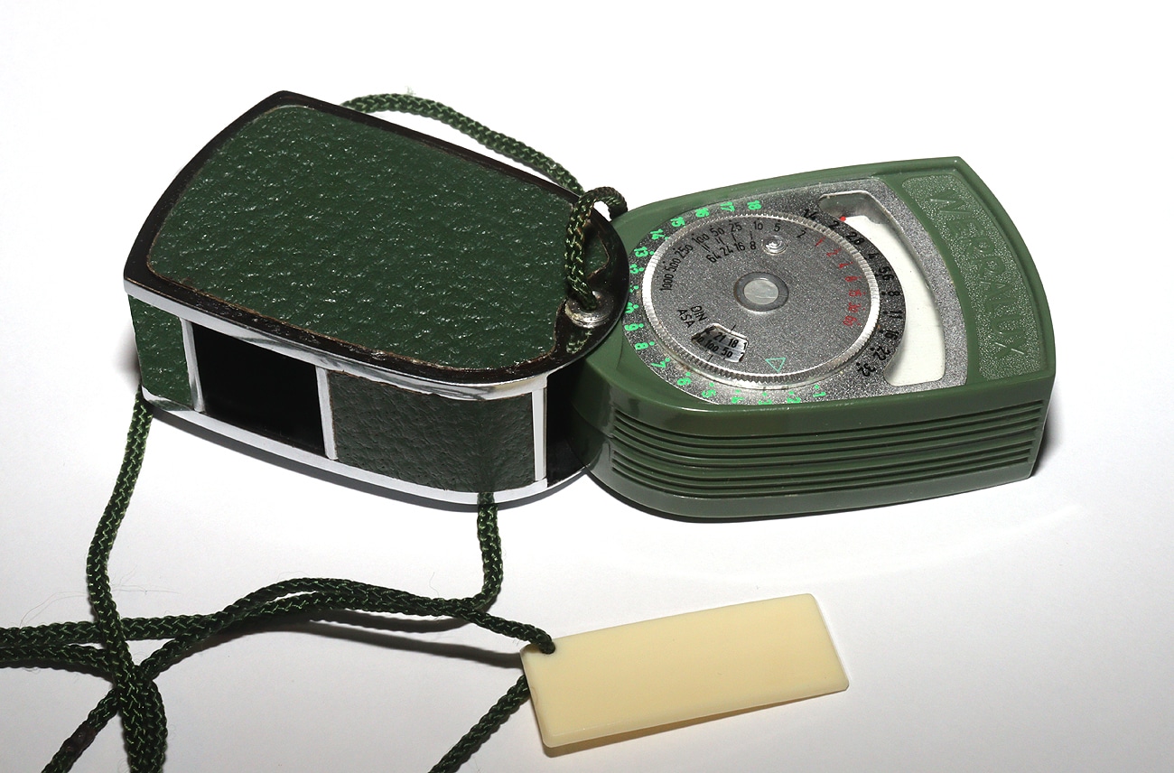 Fotoelektrischer Belichtungsmesser mit Selen-Zelle und aufsteckbarem Diffusor, hergestellt in der DDR in der zweiten Hälfte der 1950er Jahre. Die Nachführeinrichtung wurde anhand von drei Messpunkten der jeweils eingebauten Selen-Zelle angeglichen (gewissermaßen eine Art Eichung). Blendenwerte von 1,4 bis 32; Belichtungszeiten von 1/1.000 Sekunde bis 60 Sekunden; Filmempfindlichkeit in DIN und ASA einstellbar; Cine-Skala von 8 bis 64 Bilder pro Sekunde. Im grünen Metalletui verschraubt. Hersteller: VEB Feingerätewerk Weimar (FGW). Im Museum mit Anleitung und Originalkarton.