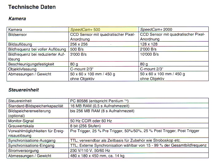 Die sehr kompakte und massiv ausgeführte Kamera (links im Bild) ist mittels Kabel mit einem Windows-95-Rechner verbunden, der alle Funktionen steuert. Die Kamera, die Beschleunigungen bis 80 g aushält, ist sogar für Crashtests der Automobilindustrie geeignet. Das hießt: Sie könnte, ohne Schaden zu nehmen, bei einem simulierten Frontalaufprall zweier Pkw eingesetzt werden, um die Vorgänge im Inneren der Fahrerkabine aufzuzeichnen.