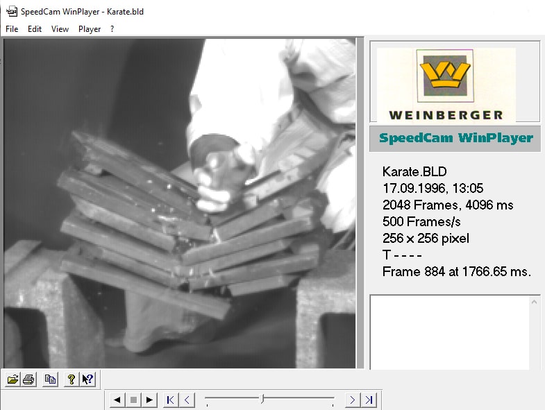 Sensationelles Exponat im Deutschen Kameramuseum Plech: die SpeedCam+ 500 – ein ehemals 40.000 Mark teures Wunderwerk der Technik, made in Germany, genauer: in Erlangen, aus dem Jahre 1998. Die – voll funktionsfähige und vorführbereite – SpeedCam+ 500 der Weinberger AG ist ein „Hochgeschwindigkeits-Videosystem für die Analyse schnell ablaufender Vorgänge“ (Prospekt). Damit kann man den Flug der Kolibris entzaubern, zerplatzende Glühbirnen beobachten, explodierenden Treibladungen in Auto-Airbags zuschauen oder einen Wassertropfen bewundern, der auf eine Wasseroberfläche trifft. Die modernsten Analog-Spiegelreflex-Kameras schafften nicht einmal zehn Bilder pro Sekunde, diese Videokamera mit CCD-Sensor und einer Bildauflösung von allerdings nur 256 x 256 Pixel belichtet bei voller Auflösung gut 500 Bilder in der Sekunde; bei reduzierter Auflösung wurden in der Praxis sogar schon gut 3.000 Aufnahmen in der Sekunde erreicht.