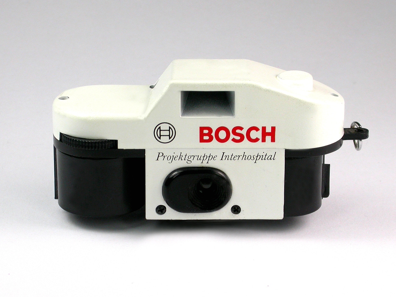 Pocket-Werbekamera (hier ohne eingelegten Film) für den Bosch-Konzern, 1970er Jahre, Aufschrift: „Projektgruppe Interhospital“. Die als Kfz-Zubehörhersteller bekannt gewordene Stuttgarter Firma besitzt heute noch einen wichtigen medizintechnischen Bereich.