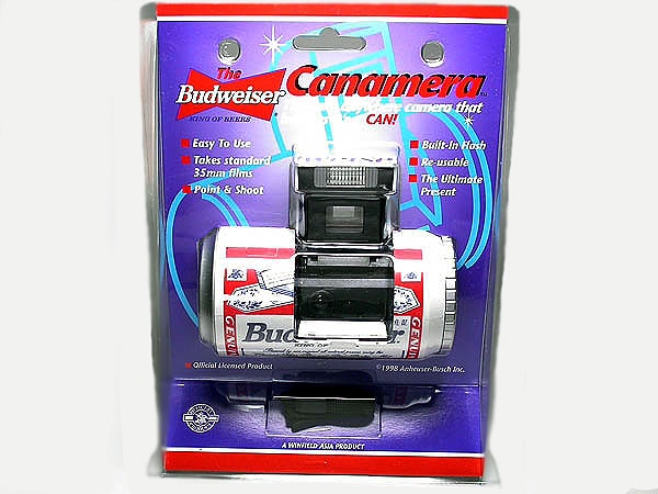 Kleinbildkamera in Form einer Bierdose mit eingebautem Elektronenblitzgerät. Das Innenleben  sieht aus wie bei der Krombacher Bierdosen-Kamera oder bei der Coca-Cola-Dosen-Cam. Lizensiert 1998 von Anheuser-Busch.