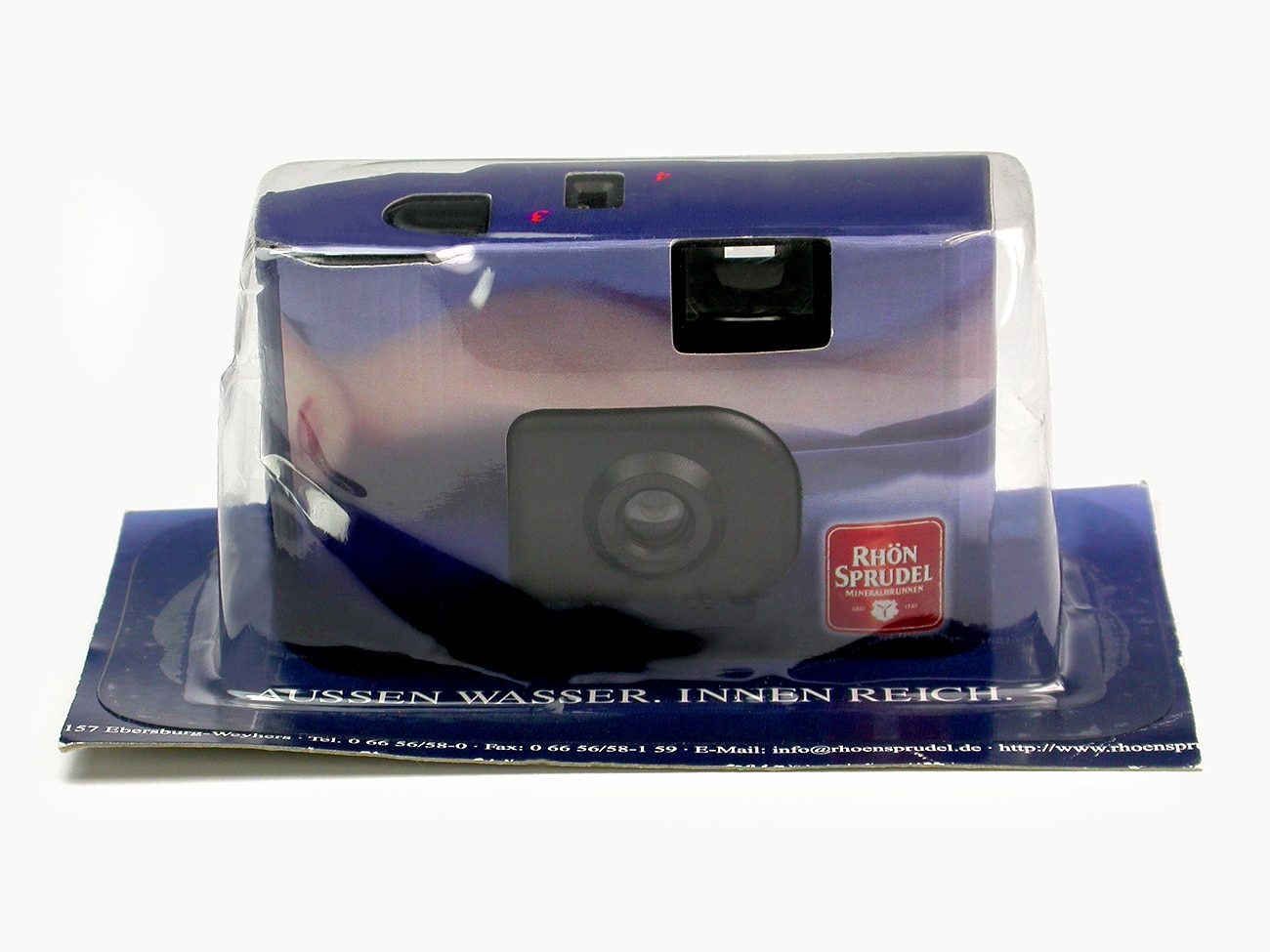 Werbung für das Unternehmen „Rhön Sprudel Mineralbrunnen“: Einwegkamera für den Kleinbildfilm 135 (Aufnahmeformat 24 x 36 mm), wahrscheinlich aus den 1990er Jahren. Fixfokusobjektiv, Durchsichtsucher, Bildzähler. Typisches Kunststoffgehäuse mit bedruckter Kartonummantelung. Keine weiteren technischen oder Herstellerangaben; ungewöhnliche, noch ungeöffnete Verpackung.