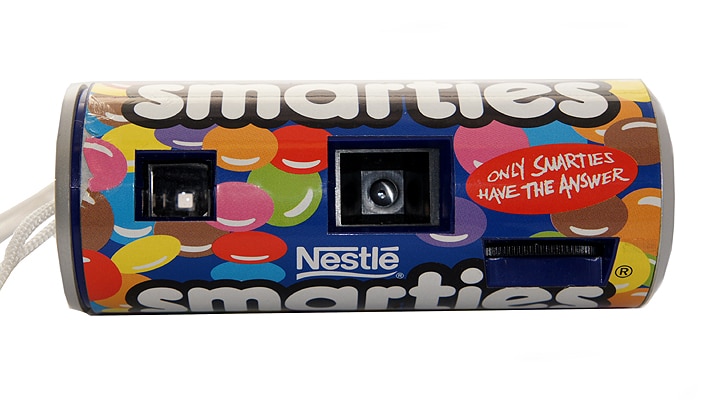 Werbe-Pocket für Smarties von Nestlé. Eine typische chinesische Dosen-Pocketkamera für den Pocketfilm 110 (Aufnahmeformat 13 x 17 mm). Objektiv ohne Bezeichnung; Fixfokus. Durchsichtsucher. Einfachverschluss; manuelle Belichtungssteuerung. Manueller Filmtransport mittels Rändelrad auf der Vorderseite.