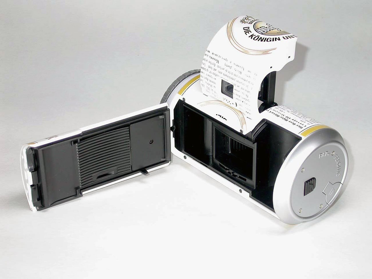 Kleinbildkamera in Form einer Bierdose mit eingebautem Elektronenblitzgerät. Das Innenleben sieht aus wie bei der Krombacher Bierdosen-Kamera oder bei der Coca-Cola-Dosen-Cam.