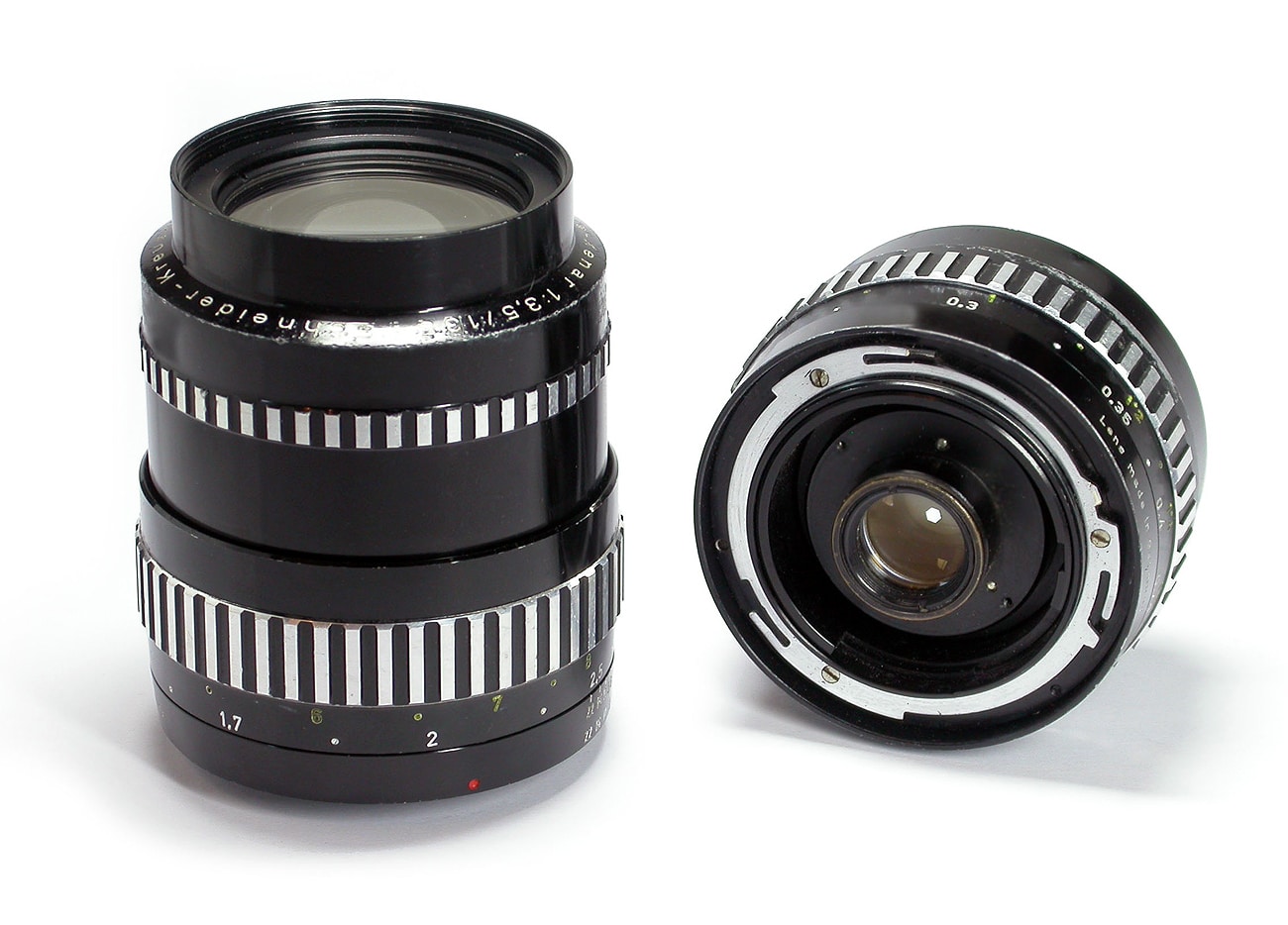 Wechselobjektive für die Wirgin Edixa-Rex D mit Bajonettverriegelung, die aber reichlich filigran daherkommt. Links ein Edixa-Tele-Xenar von Schneider-Kreuznach 1:3,5/135 mm.