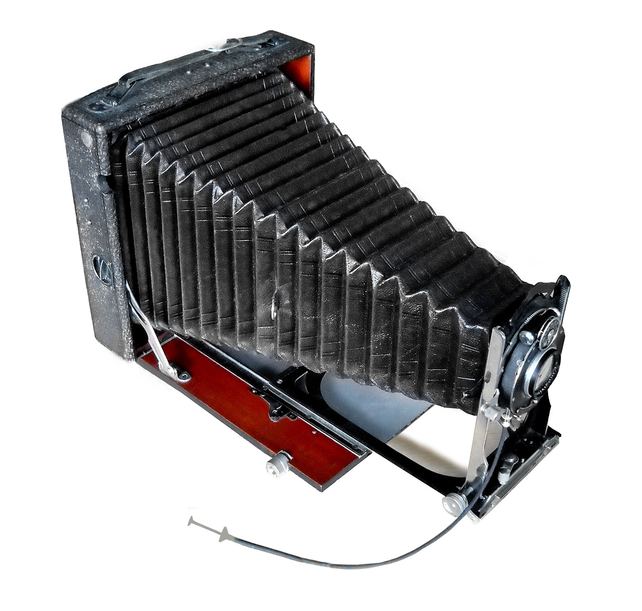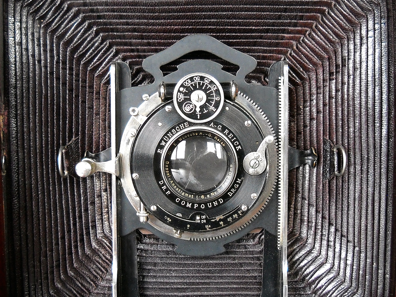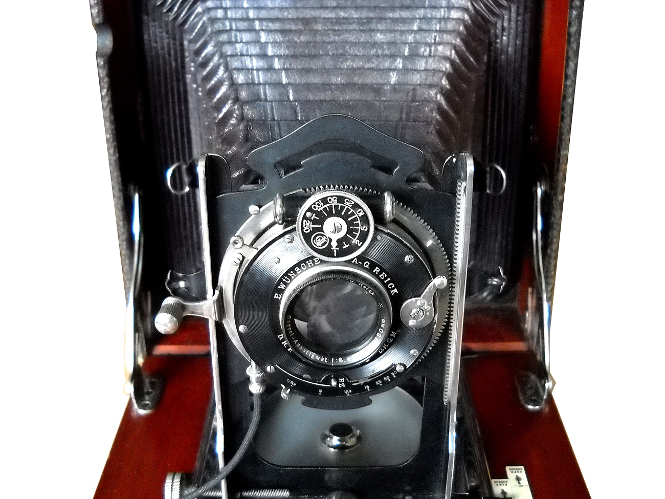 Großformatige (13 x 18 cm) deutsche Kamera für Platten oder Filmpacks von Emil Wünsche A.G., Reick bei Dresden, gebaut in verschiedenen Versionen etwa von 1904 bis 1910. Holzkorpus, innen poliert, außen Lederbezug, Doppelter Auszug, Balgen aus Leder. Klappkonstruktion. Drehbarer Sucher für Hoch und Queraufnahmen, zwei Stativmuttern. Mechanischer Zentralverschluss Compound mit T, B und 1 bis 1/250 Sekunde.