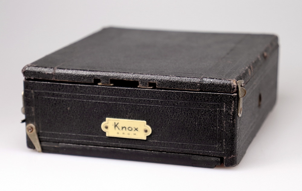 Aus dem Werbeprospekt: „Universal-Hand- und Stativ-Camera Knox Modell III. Für Bilder 9 x 12 cm. Schwarzer, lederartiger Überzug, achromatische Linse, Moment- und Zeitverschluss, durch Fingerdruck auslösbar. Revolverblenden, drehbarer Sucher für Hoch- und Queraufnahmen. Einstellskala und Mattscheibe. Zwei Stativmuttern. Calicobalg mit Lederecken. Preis der Camera komplett mit Objektiv, Momentverschluss und 1 Doppel-Cassette mit Aluminiumschiebern M 18,75“. Calico (Kaliko) ist ein kunstlederähnliches Baumwollgewebe, das seit dem frühen 19. Jahrhundert für Bucheinbände verwendet wurde.