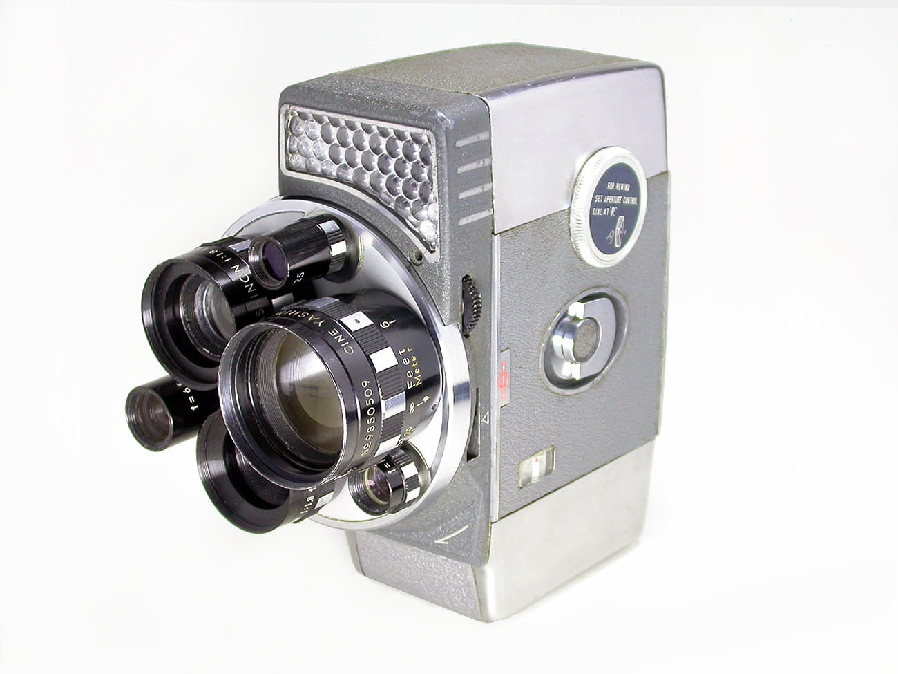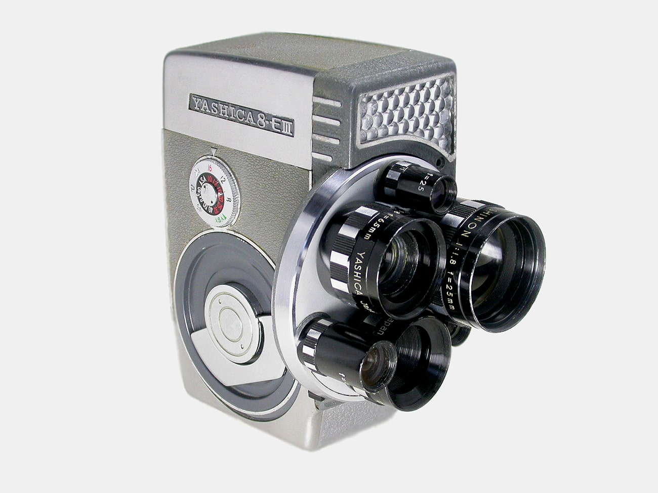 Massive Schmalfilmkamera für Doppel-8-Spulen, hergestellt von Yashica, Japan, in den Jahren 1959 und 1960 in 98.783 Exemplaren – im Foto-Quelle-Katalog Nr. 622 von 1962. Objektivrevolver mit drei Sucher- und drei Aufnahmeobjektiven: Cine Yashinon: 1:1,8/10 mm, 1:1,8/6,5 mm (jeweils Fixfokus) und 1:1,8/25 mm, manuelle Fokussierung. Fernrohrsucher. Federwerksantrieb (Einzelbild; 8, 12, 16, 24, 32 und 48 Bilder pro Sekunde). Belichtungsmesser mit Selen-Zelle; manuelle Belichtungssteuerung. Konversions-, Grau- und UV-Filter eingebaut. Rückspulvorrichtung für Überblendungen. Anschlüsse für Drahtauslöser und Stativ.