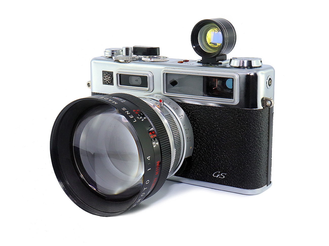 Hier mit dem Telekonverter Yashikor Aux Telephoto S 103 (1:4), der vor das eingebaute Objektiv geschraubt und zusammen mit dem abgebildeten Aufstecksucher („Tele-Wind Finder“) verwendet wird. Telewirkung: wie 58 mm.