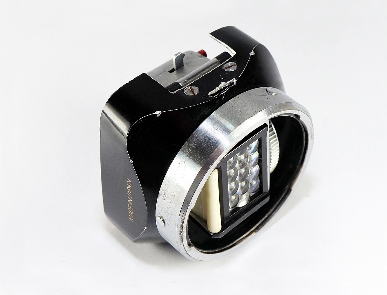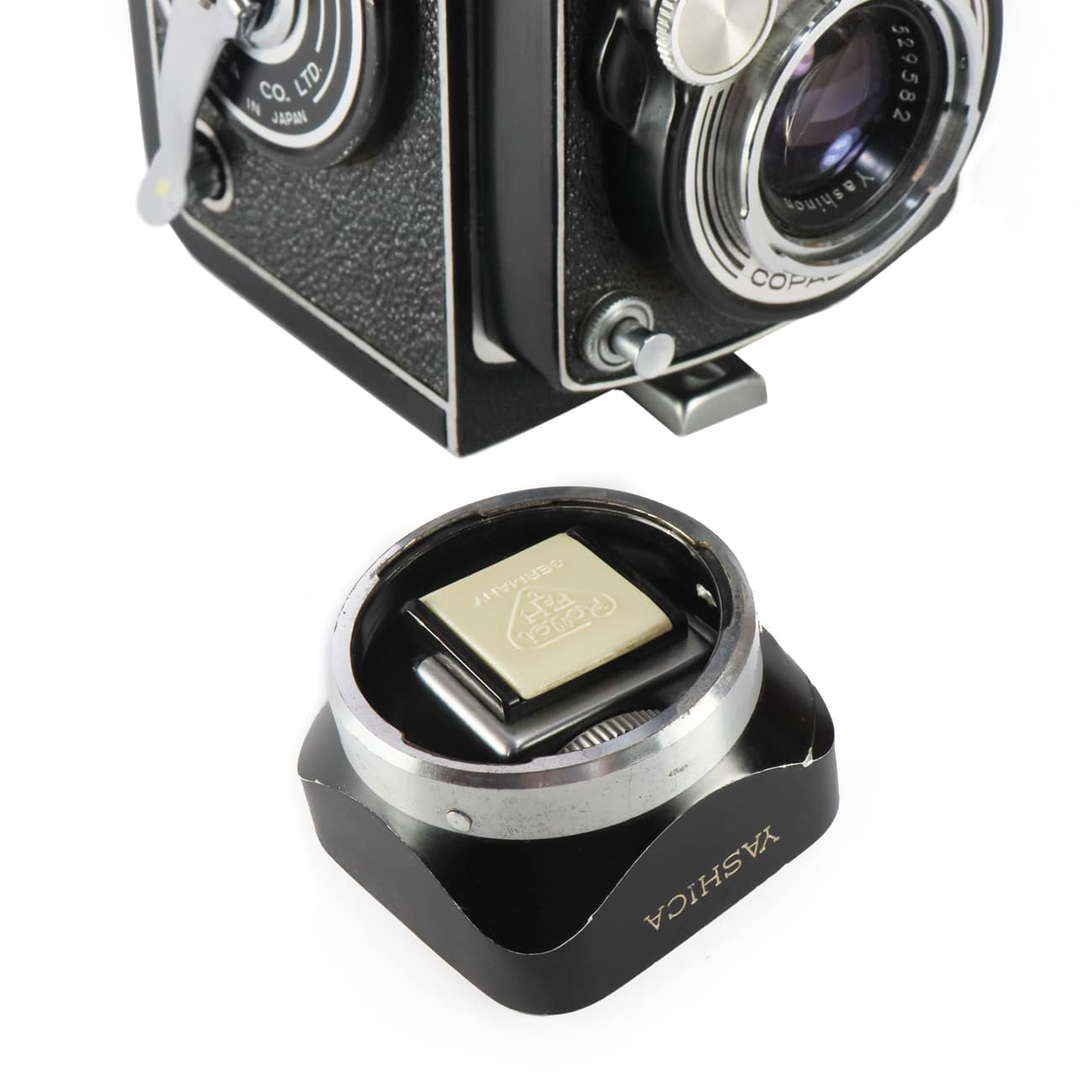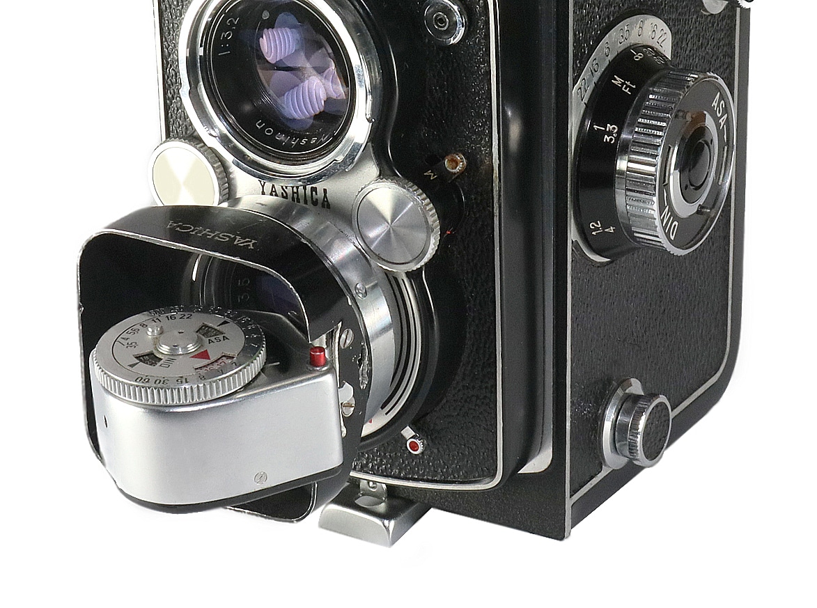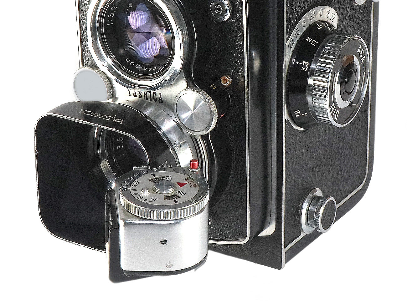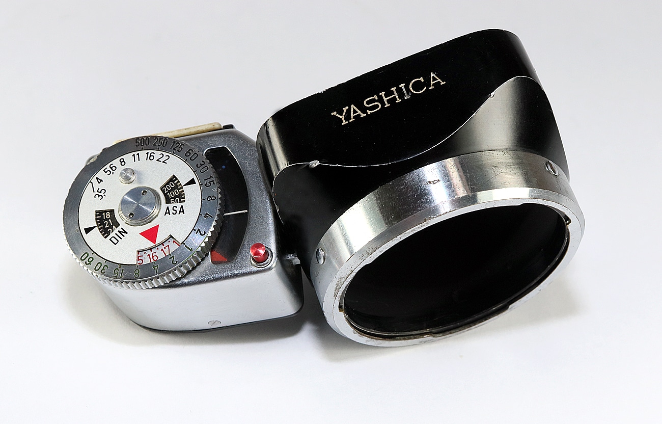 Ab und an denken die Macher des Deutschen Kameramuseums angesichts eines neu hereingekommenen Exponats, sie wären einer fotohistorischen Sensation auf der Spur – wie hier bei diesem bislang unbekannten Belichtungsmesserzubehör für eine Yashica-Mat. Niemand der Kollegen hatte so etwas vorher an einer TLR von Yashica gesehen: ein kleiner Selenbelichtungsmesser, ausklappbar eingebaut in eine Gegenlichtblende von Yashica.