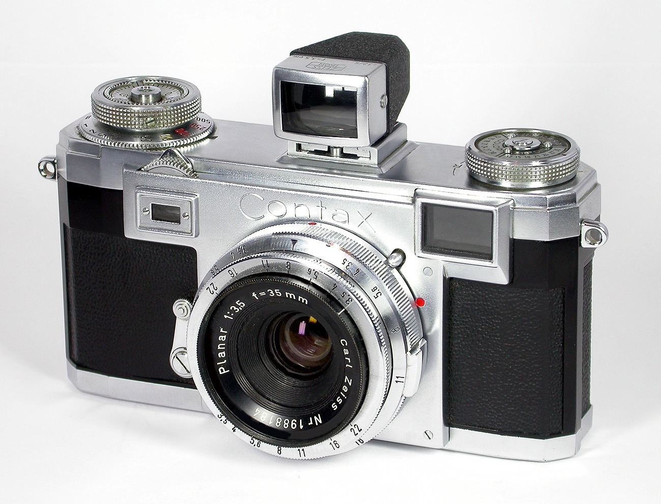 Weitwinkel-Objektiv Carl Zeiss Planar 1:3,5/35 mm mit dem entsprechenden Spezial-Sucher 432/5 für die klassischen Contax-Kameras. Seriennummer: 1988184.