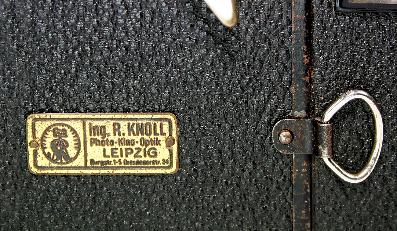 Hier eine Kamera mit aufgesetztem Filtervorsatz und einem aufgenieteten Firmenschild des Leipziger Fotohauses „Ing. R. Knoll Photo-Kino-Optik Leipzig“.