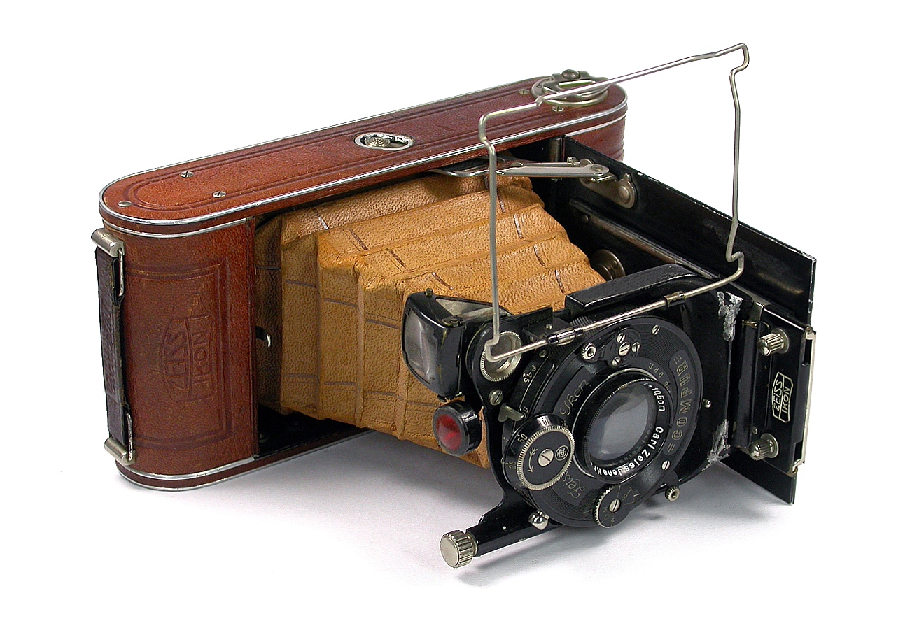 Klapp-/Laufbodenkamera aus den 1920er Jahrern für den Rollfilm 120 (Aufnahmeformat 6 x 9 cm), hier mit Objektiv Carl Zeiss Jena Tessar 1:4,5/10,5 cm. Manuelle Schärfeeinstellung mittels Laufboden. Brillant- und Rahmensucher, Wasserwaage. Mechanischer Zentralverschluss Compur (1 bis 1/250 Sekunde), Anschluss für Drahtauslöser, manuelle Belichtungssteuerung.