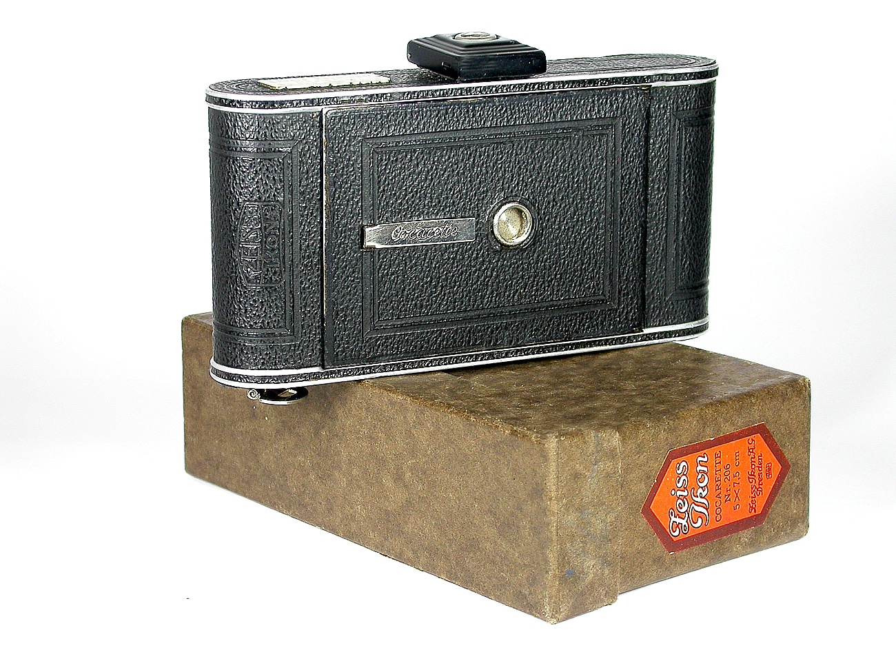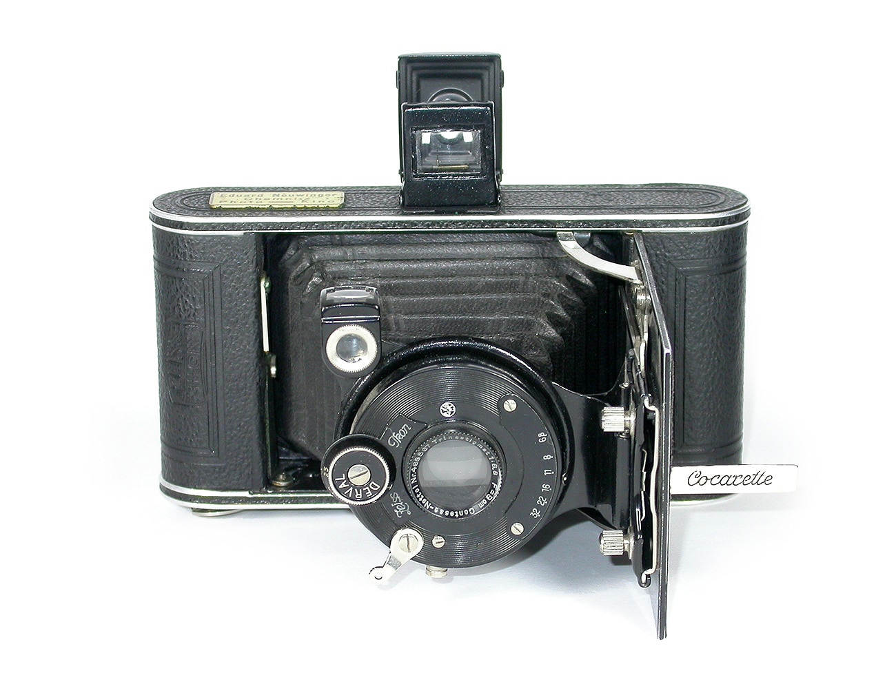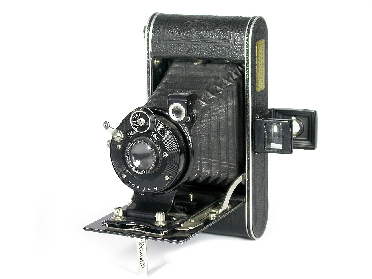 Elegante Klapp-/Laufbodenkamera für das Aufnahmeformat 5 x 7,5 cm, vermutlich auf Rollfilm 127 (eine „normale“ Rollfilmspule ist zu lang); hergestellt von 1926 bis 1930. Objektiv: Contessa-Nettel Trinanastigmat 1:6,8/9 cm. Aufklappbarer Fernrohrsucher. Zentralverschluss Derval mit den Einstellungen T, B, 1/25, 1/50 und 1/100 Sekunde.