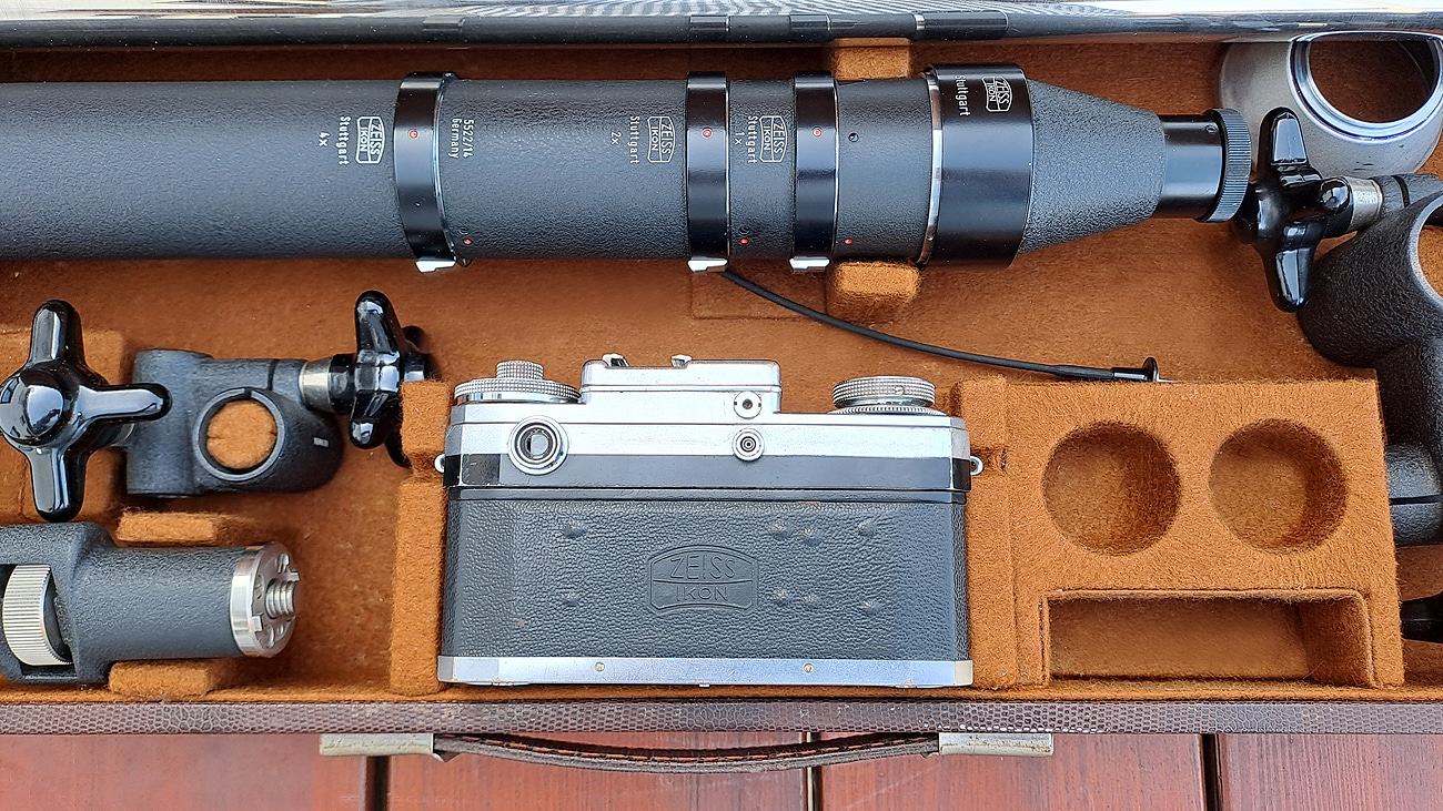 Dieses Museumsexemplar – im Bild montiert an einem Zeiss Ikon Reise-Reproduktionsgerät – ist gut erhalten und funktionsfähig. Nennenswerte Gebrauchsspuren gibt es nur wie üblich am Stativgewinde, sonst glänzt und blinkt das Metall weitestgehend. Alle Bedienelemente sind leichtgängig, die Optik sauber. Der Buchstaben „L“ vor der Seriennummer 77070 deutet übrigens darauf hin, dass dieses Exemplar aus der Zeit von 1956 bis Ende der 1950er Jahre stammt.