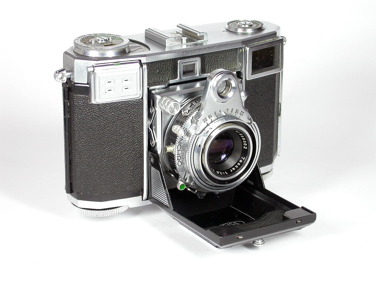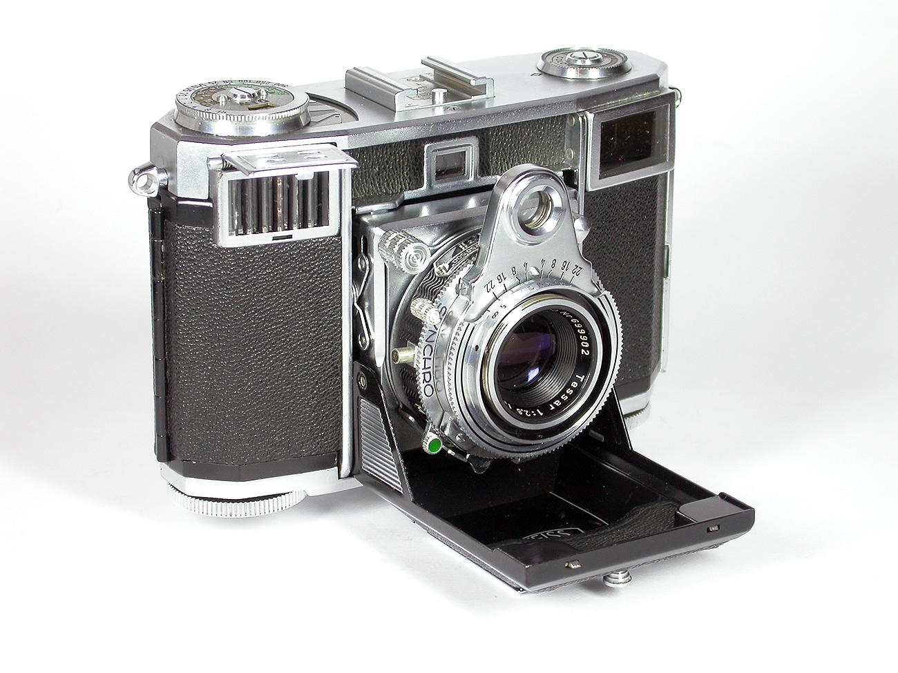 Wunderschöne Messsucherkamera für den Kleinbildfilm 135 (Aufnahmeformat 24 x 36 mm), hergestellt 1950 bis 1955 in Stuttgart. Fest eingebautes Objektiv Zeiss-Opton Tessar 1:2,8/45mm. Mechanischer Synchro-Compur-Zentralverschluss (schnellste Verschlusszeit 1/500 Sekunde). Eingebauter ungekuppelter Belichtungsmesser (Integralmessung), gekuppelter Entfernungsmesser (Drehkeilentfernungsmesser; ein Bauteil hiervon ist das „Auge“ in der Mitte über dem Objektiv). Doppelbelichtungssperre, Filmmerkscheibe, Zubehörschuh. Das Filmtransportrad am Boden funktioniert auch in der Bereitschaftstasche aus Leder.