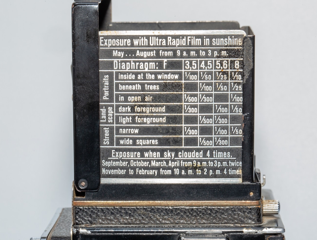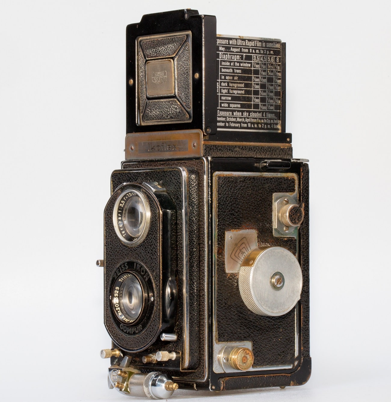 Doppeläugige Spiegelreflexkamera (TLR) für den Rollfilm 120 (Aufnahmeformat 6 x 6 cm), hergestellt in Deutschland von 1938 bis 1951. Aufnahmeobjektiv: Carl Zeiss Jena Triotar 1:3,5/7,5 cm, Nr. 2023929; Sucher-Objektiv: Sucher-Anastigmat Teronar 1:3,5/7,5 cm. Zentralverschluss Compur (1 bis 1/500 Sekunde); Belichtungstabelle außen am Sucherschacht in englischer Sprache, jedoch an der Entfernungseinstellung eine Meterskala. Doppelbelichtungssperre, Bildzähler; Rotfenster auf der Unterseite.