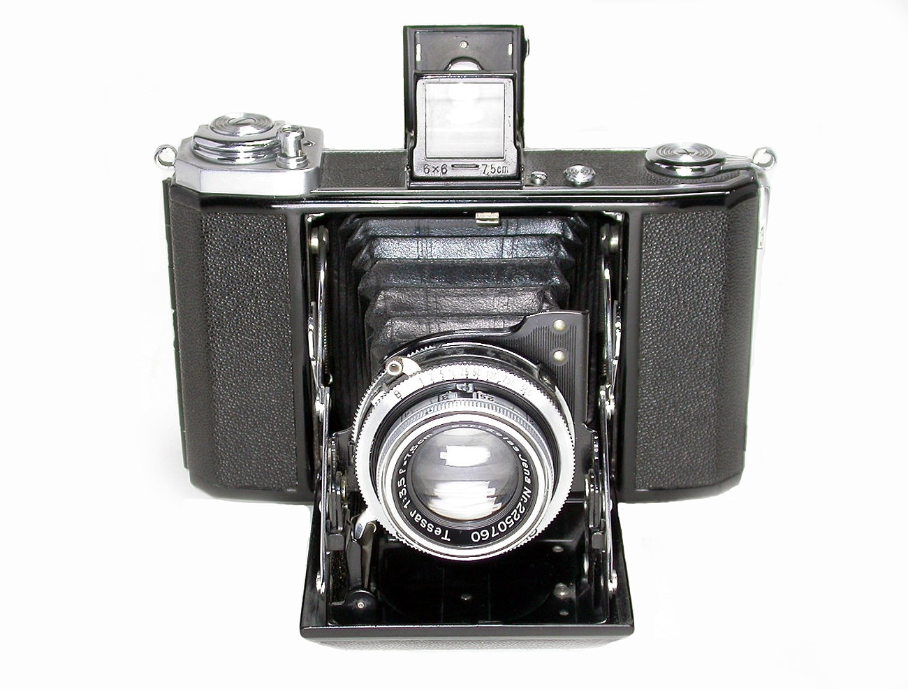 Klapp-/Spreizenkamera für den Rollfilm 120 (Aufnahmeformat 6 x 6 cm), hergestellt von 1948 bis 1952. Ausführung mit Objektiv Tessar 1:3,5/75 mm von Carl Zeiss Jena (Nummer 2250760) und Verschluss Compur-Rapid (B und 1 bis 1/500 Sekunde). Aufklappbarer Fernrohrsucher, Doppelbelichtungssperre; noch kein Kontakt zur Blitzsynchronisation.