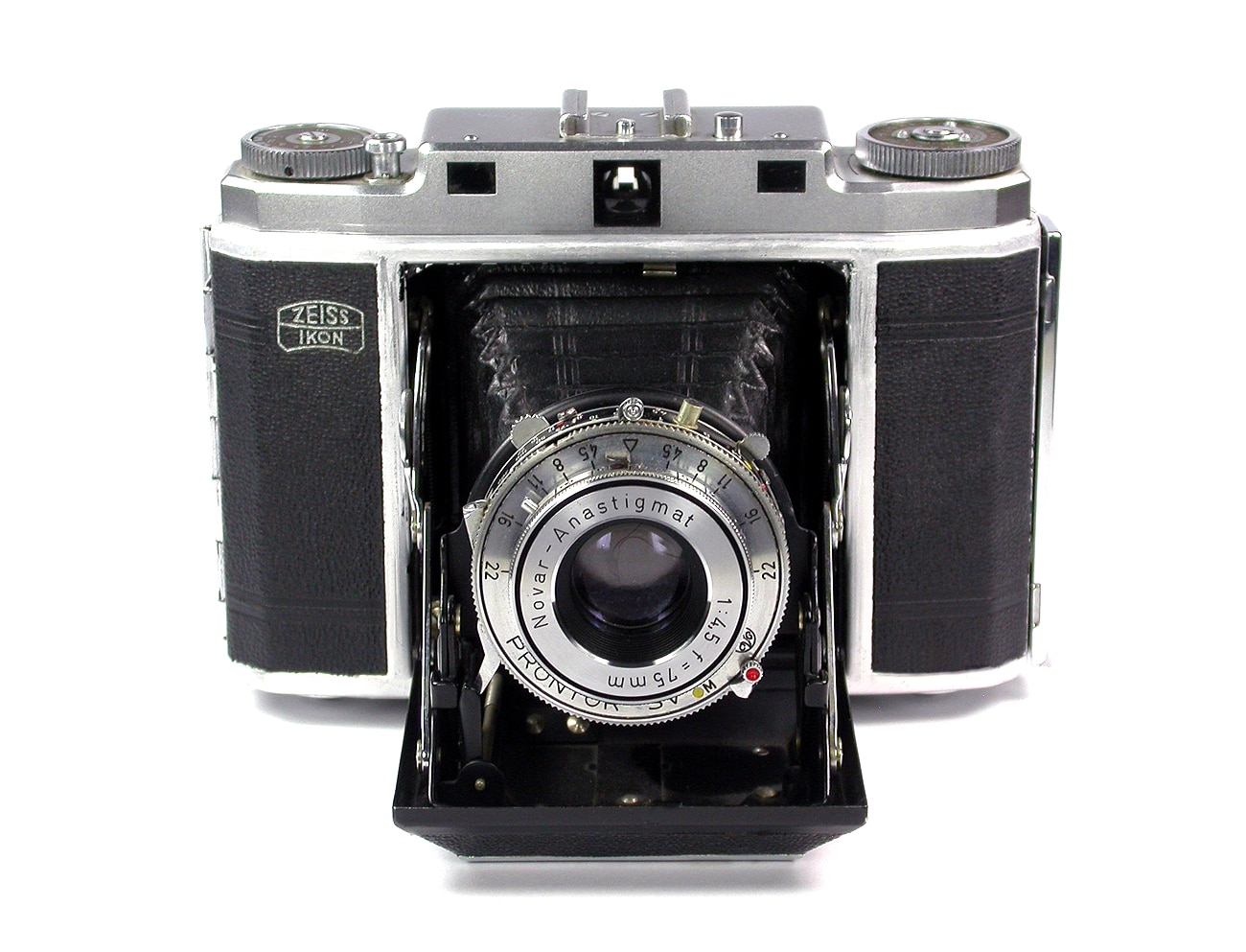 Klapp-/Spreizenkamera für den Rollfilm 120 (Aufnahmeformat 6 x 6 cm), hergestellt ab 1951. Die Zeiss Ikon AG, Stuttgart, stellte diesen Apparat auf der Photokina 1951 als einen „völlig neuen Kameratyp“ vor. Die einfachere Bauweise eines ungekuppelten Entfernungsmessers ermöglichte laut Prospekt einen günstigeren Kamerapreis als bei Kameras mit gekuppeltem Entfernungsmesser. Durch Drehen des Drehrades (im Bild links oben neben dem Auslöser) wurde die Schärfe ermittelt und der Wert musste dann manuell aufs Objektiv übertragen werden. Weitere Ausstattung: Objektiv: Novar-Anastigmat 1:4,5/75 mm, Prontor-SV-Verschluss (B, 1 bis 1/300 Sekunde, mit Vorlaufwerk und Blitzsynchronisation), Doppelbelichtungssperre, Filmmerkscheibe.