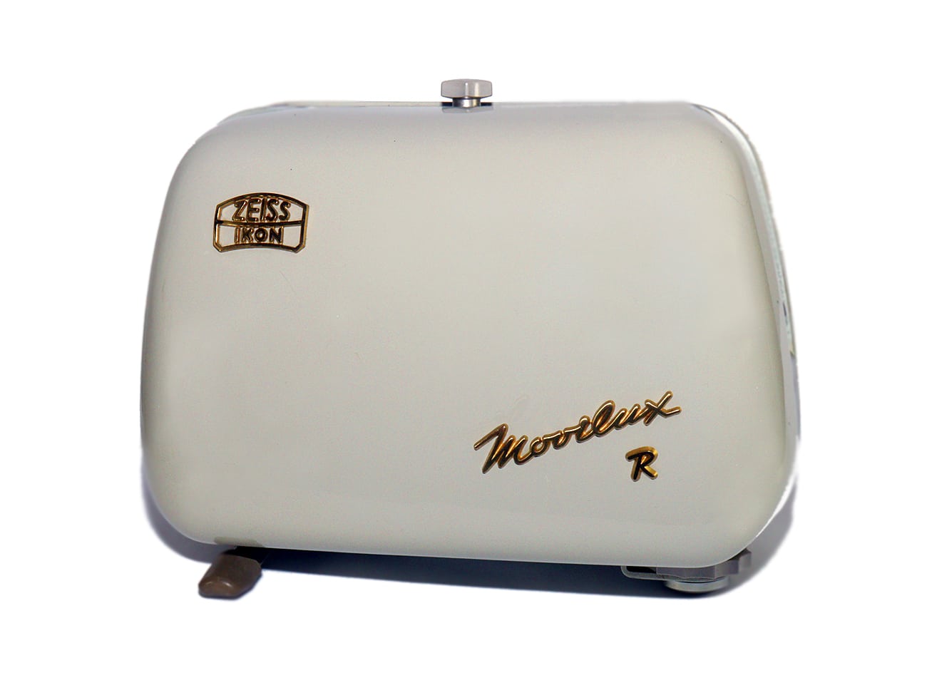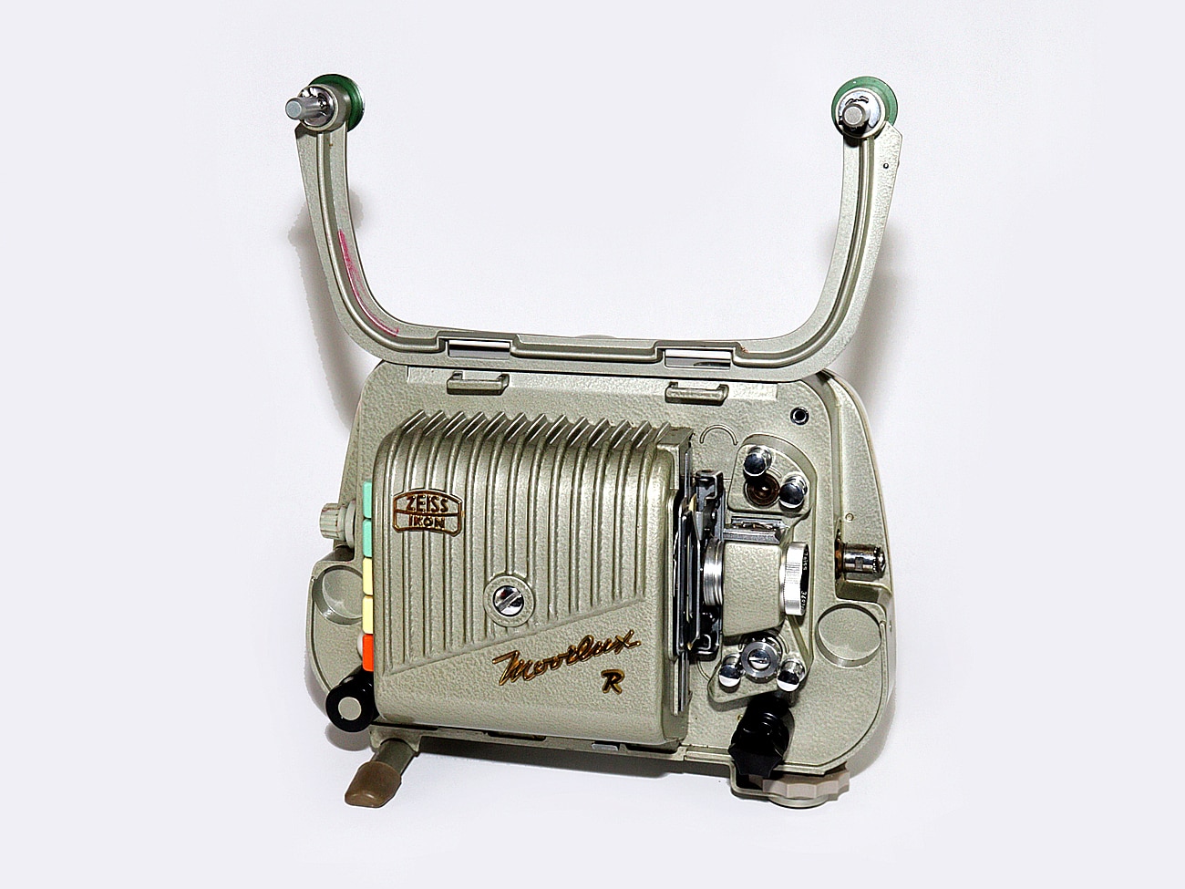 Schmalfilmprojektor für Normal-8-Film von Zeiss Ikon (1962) in der Größe einer Damenhandtasche, aber mit einem Gehäuse aus Metalldruckguss. Der Movilux 8 R ist eine Weiterentwicklung des Zeiss Ikon Movilux 8 B, der um ein paar Funktionen aufgerüstet wurde, wie z. B. die Möglichkeit, die Leuchtstärke zu reduzieren. Ein auf der Gehäuseoberseite zu befestigender Tonkoppler synchronisierte den Film mit einem separaten Tonbandgerät und ermöglichte so eine Tonprojektion. Die Projektionsgeschwindigkeit beträgt konstant 16 Bilder/Sekunde. Der Filmvorschub erfolgt über zwei jeweils einreihige Zahnrollen, das Filmeinfädeln muss manuell vorgenommen werden. Der Hauptantrieb einschließlich Rückspulung erfolgt elektrisch mit Spannungen von 110 bis 240 Volt, die Lampe hat eine Leistung von 50 Watt bei 8 Volt. Verschiedene Objektive standen zur Verfügung: 1:1,2/18 mm oder ein Zoom 1:1,4/15-25 mm. Die maximale Spulengröße erlaubt Filmlängen von 120 Meter. Zur Projektion wurde der hier nach unten geklappte Metallarm mit den beiden Spulenhalterungen nach oben geschwenkt, mit dem Rändelrad befestigt und schon konnte es losgehen. Die farbigen Tasten der Drucktastensteuerung (links im Bild) waren übrigens sogar beleuchtet.