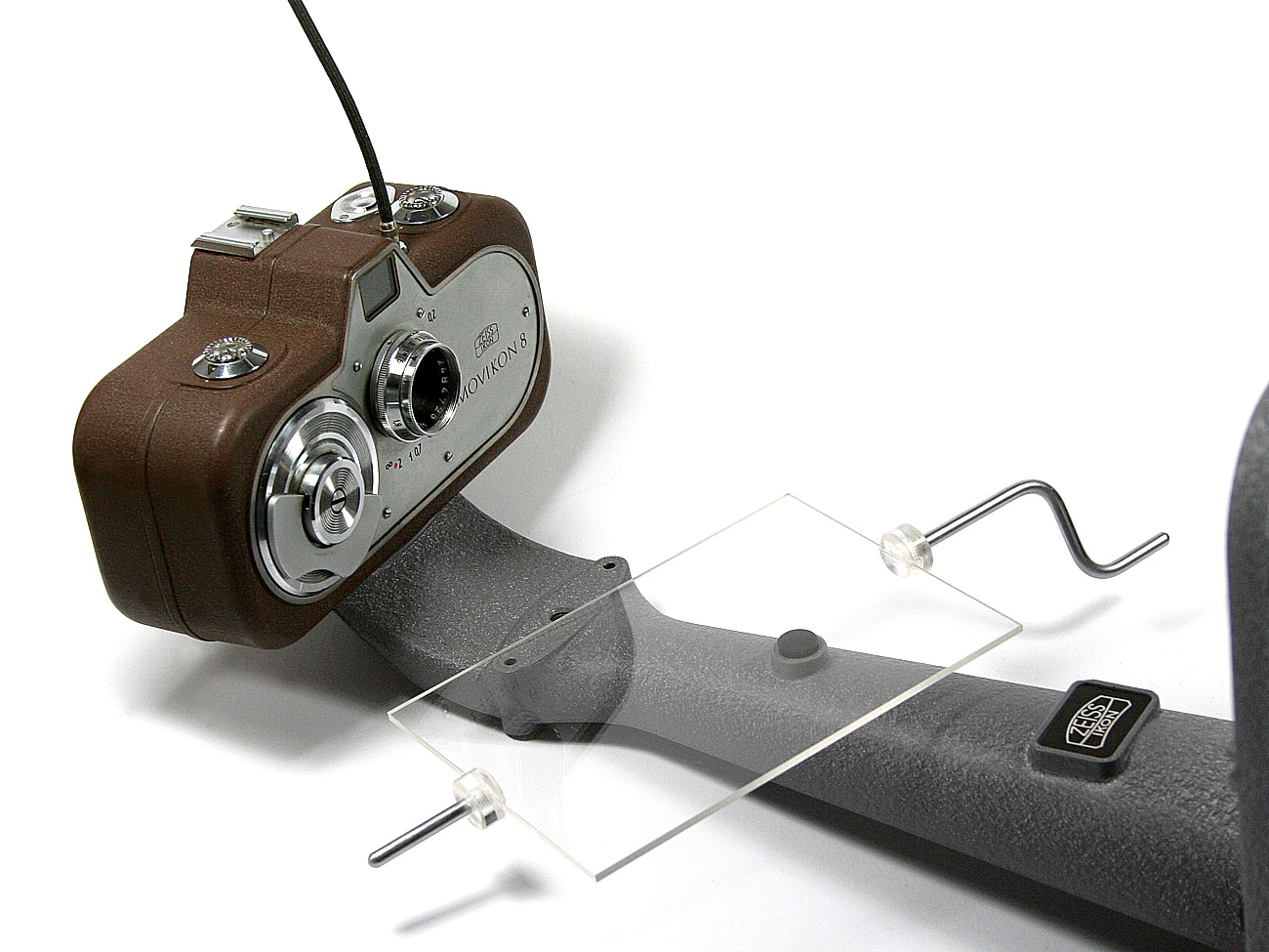 Ein massives Reprostativ mit Titeleinrichtung für Zeiss-Schmalfilmkameras, hier mit der Zeiss Ikon Movikon 8 im braunen Gehäuse. Um die Titeleinrichtung (die hier ausgeklinkte Plexiglasplatte, die per Kurbel drehbar gelagert ist) nutzen zu können, müsste man das Stativ in horizontale Lage bringen oder entsprechend aufbocken.