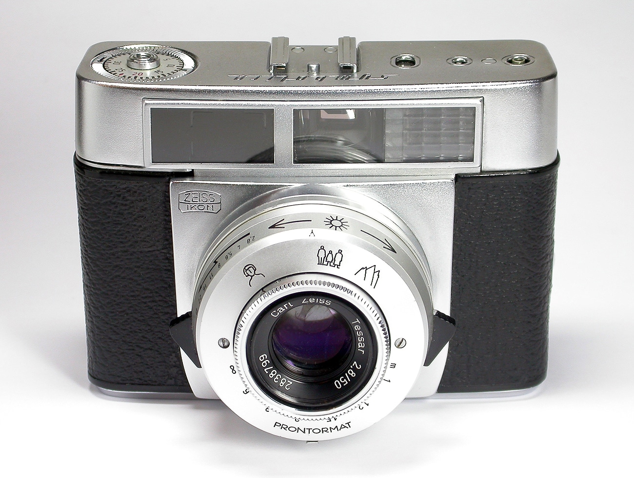 Sucherkamera für den Kleinbildfilm 135 (Aufnahmeformat 24 x 36 mm), hergestellt von 1960 bis 1962. Die leicht futuristisch aussehende Kamera hat einen Prontormat-Verschluss und als Objektiv ein Tessar 1:2,8/50 mm. Entfernungseinstellung nach Symbolen. „Im kristallklaren Leuchtrahmensucher der neuen Symbolica ist jetzt die Belichtungsmesseranzeige eingespiegelt. Neben dem eingebauten Steckschuh befindet sich an der Symbolica jetzt eine ‚Blitzsteckdose‘. Diese Steckdose ist für das neue Zeiss Ikon Blitzgerät Ikoblitz 4 gedacht, das ohne Kabel direkt durch Aufstecken mit der Kamera verbunden wird. Blitzgeräte mit Kabel können aber ebenfalls verwendet werden“, schwärmt die Produktinformation von 1960.