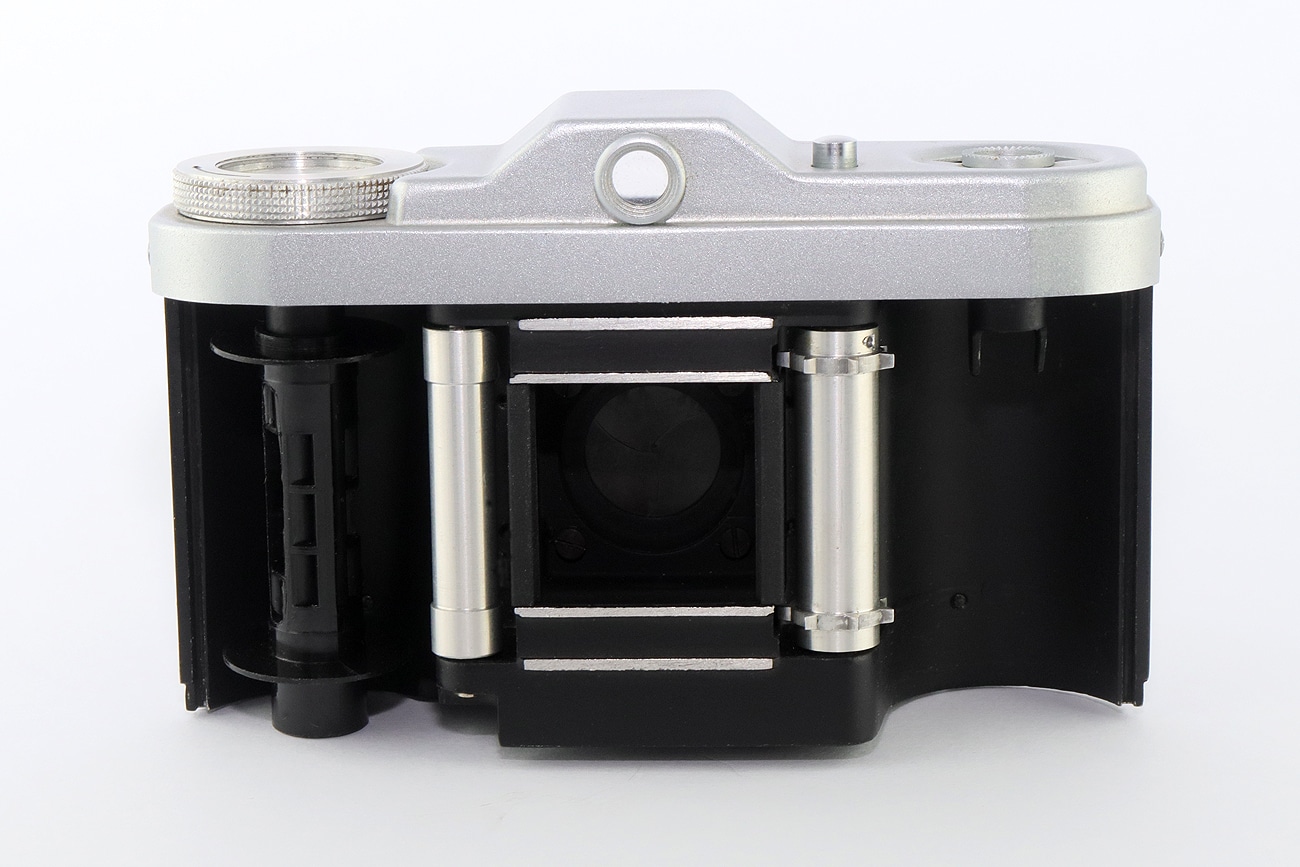 Sucherkamera für den Kleinbildfilm 135 (Aufnahmeformat 24 x 24 mm), hergestellt von 1953 bis 1959 im VEB Zeiss Ikon. Mit Schnellschalthebel auf der Kameravorderseite. Da Verschlussaufzug und Filmtransport gekoppelt waren, entstand so eine Schnellschusskamera mit bis zu zwei Bildern pro Sekunde. Verschlüsse: Tempor (hier im Bild) mit B sowie 1 bis 1/300 Sekunde beziehungsweise Vebur mit 1 bis 1/250 Sekunde; Objektive: Carl Zeiss Tessar 1:3,5/37,5 mm (Seriennummer: 3931030), vergütet (hier im Bild) oder Novonar 1:3,5/35 mm. Weiterentwicklung der Tenax.