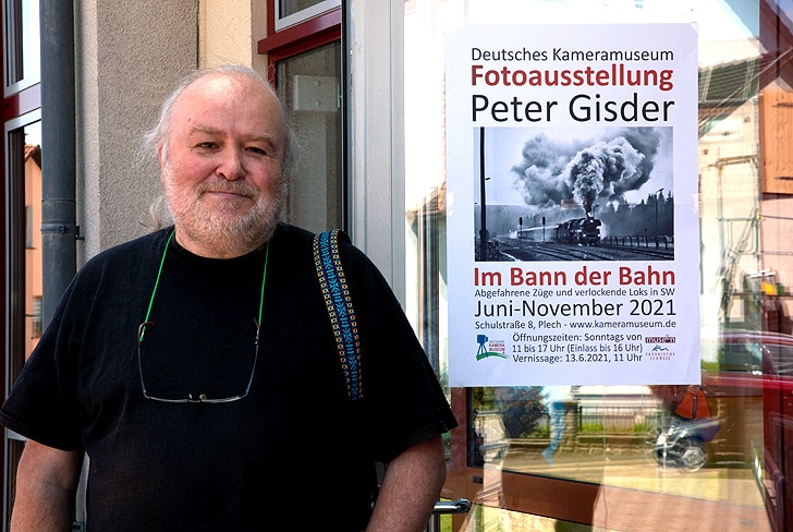 Peter Gisder („verheiratet, ein Sohn, leider nicht eisenbahnaffin, aber verständnisvoll“) hat einige Dutzend seiner packenden Eisenbahnfotos in der ersten „Nach-Corona-Ausstellung“ im Deutschen Kameramuseum in Plech ausgestellt.